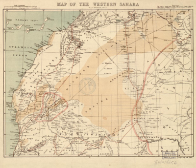 The Spanish presence in the region of modern-day Western Sahara lasted from 1884 to 1975. While initial Spanish interest in the Sahara was focused on using it as a port for the slave trade, by the 1700s Spain had transitioned economic activity on the Saharan coast towards commercial fishing.[29] By the 19th century, Spain had claimed the southern coastal region and penetration of the hinterland gradually followed; later in 1904 the northern region was acquired. After an agreement among the European colonial powers at the Berlin Conference in 1884 on the division of spheres of influence in Africa, the same year Spain seized control of Western Sahara and established it as a Spanish colony.[30] Despite establishing their first colony in the region at Río de Oro Bay in 1884, the Spanish were unable to pacify the interior of the region until the 1930s. Raids and rebellions by the indigenous Saharan population kept the Spanish forces out of much of the territory for a long time. The territory was eventually subdued by joint Spanish and French forces in 1934, the same year the Spaniards divided their Saharan territories into two regions named after the rivers: Saguía el-Hamra and Río de Oro. After 1939 and the outbreak of World War II, this area was administered by Spanish Morocco. In 1958, Spain joined the district of Saguia el-Hamra (the "Red River") in the north with the Río de Oro (in the south) to form the province of Spanish Sahara, following Morocco's claiming these regions in 1957. As a consequence, Ahmed Belbachir Haskouri, the Chief of Cabinet, General Secretary of the Government of Spanish Morocco, cooperated with the Spanish to select governors in that area. The Saharan lords who were already in prominent positions, such as the members of Maa El Ainain family, provided a recommended list of candidates for new governors. Together with the Spanish High Commissioner, Belbachir selected from this list. During the annual celebration of Muhammad's birthday, these lords paid their respects to the caliph to show loyalty to the Moroccan monarchy.