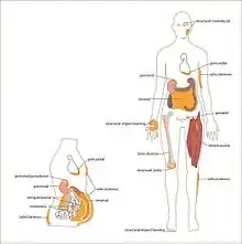 White adipose tissue is most abundant in mammals and its distribution greatly varies among different species.[8] Usually white adipose tissue can be found in two different locations of the body where it is stored: subcutaneous adipose tissue and intra-abdominal adipose tissue. Subcutaneous adipose tissue is directly underneath the skin, while the intra-abdominal adipose tissue surrounds the organs inside the abdomen such as intestine and kidneys.[8] The intra-abdominal adipose tissues covers the thoracic and abdominal cavity. The visceral adipose tissue is part of the intra-abdominal adipose tissue that surrounds the intestine for the most part.[8] White adipose tissue exists mostly as a single adipocytes in the subcutaneous tissue.[9]