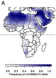 The A111T mutation in the SLC24A5 gene predominates in populations with Western Eurasian ancestry. The geographical distribution shows that it is nearly fixed in all of Europe and most of the Middle East, extending east to some populations in present-day Pakistan and Northern India. It shows a latitudinal decline toward the Equator, with high frequencies in North Africa (80%), and intermediate (40−60%) in Ethiopia and Somalia.[25]