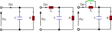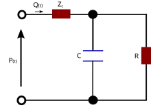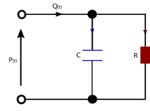 In the blood circulation, the passive elements in the circuit are assumed to represent elements in the cardiovascular system. The resistor, R, represents the total peripheral resistance and the capacitor, C, represents total arterial compliance.[7]