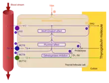 - ↑ Jing, Li; Zhang, Qiang (15 September 2022). "Intrathyroidal feedforward and feedback network regulating thyroid hormone synthesis and secretion". Frontiers in Endocrinology. 13: 992883. doi:10.3389/fendo.2022.992883. PMC 9519864. PMID 36187113.