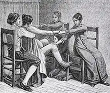 Supporters of licensing midwives said was that midwives learned the trade of childbirth through trial and error.[12] As well, midwives were consistently accused of practicing witchcraft.[13] Throughout Europe, midwifery and witchcraft had strong ties. Reasons for those ties included midwives' use of empiricism.[14] This, along with their use of herbs and mixtures, including the highly toxic belladonna, made them a target of the church and claims of witchcraft.[15] Women knew that ergot helped in labor and that certain herbs such as pennyroyal or savin "forced the courses", or in simpler terms, caused abortions.[16] Distrust grew of midwives, especially among middle and upper classes.[17]