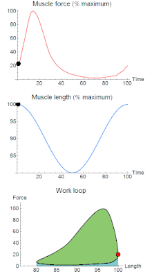 To simulate the rhythmic shortening and lengthening of a muscle (e.g. while moving a limb) and natural kinematics, a servo motor oscillates the muscle at a given frequency and range of motion observed in natural behavior. Simultaneously, a burst of electrical pulses is applied to the muscle at the beginning of each shortening-lengthening cycle to stimulate the muscle to produce force. Since force and length return to their initial values at the end of each cycle, a plot of force vs. length yields a 'work loop'. Intuitively, the area enclosed by the loop represents the net mechanical work performed by the muscle during a single cycle.