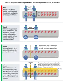 Meat and poultry processing facilities have work environments that may contribute substantially to their potential exposures, as they often work close to one another on assembly lines during prolonged work shifts. For engineering controls, CDC and OSHA recommend configuring communal work environments so that workers are spaced at least six feet apart including along processing lines, using physical barriers such as strip curtains or plexiglass to separate workers from each other, and ensuring adequate ventilation that minimizes air from fans blowing from one worker directly at another worker. For administrative controls, they recommend staggering workers' arrival, break, and departure times, cohorting workers so they are always assigned to the same shifts with the same coworkers, encouraging single-file movement through the facility, avoiding carpooling to and from work, and considering a program of screening workers before entry into the workplace and setting criteria for return to work of recovered workers and for exclusion of sick workers. For personal protective equipment, they recommend face shields and considering allowing voluntary use of filtering facepiece respirators such as N95 masks. They also recommend wearing cloth face masks that should be replaced if they become wet, soiled, or otherwise visibly contaminated during the work shift, although cloth face masks are not considered to be personal protective equipment.[4]