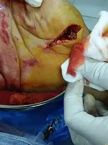 - ↑ Anderson I (2006). "Debridement methods in wound care". Nurs Stand. 20 (24): 65–6, 68, 70 passim. doi:10.7748/ns.20.24.65.s58. PMID 16526165.
