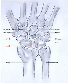 Scapholunate advanced collapse (SLAC) is a predictable pattern of wrist osteoarthritis that results from untreated long-standing scapholunate ligament rupture and the associated carpal malalignment.[4] The misalignment is described as dorsal intercalated segment instability (DISI) which is where the lunate angulates towards the dorsal side of the hand.[2][5]