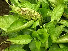 Pepper fruit do not frequently show symptoms, largely due to the fact that developing fruit is often dropped if the pepper plant is infected. Fruit that isn't dropped can also be damaged and misshapen due to increased sun exposure after plants drop infected leaves. When symptoms on the fruit do occur, they start as pale-green, water-soaked areas and eventually become raised, brown, and rough.[3][4][5]