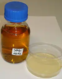 YEPD or yeast extract peptone dextrose, also often abbreviated as YPD, is a complete medium for yeast growth. It contains yeast extract, peptone, double-distilled water, and glucose (dextrose).[1] It can be used as solid medium by including agar. The yeast extract will typically contain all the amino acids necessary for growth. By being a complete medium, YEPD cannot be used as a selection medium to test for auxotrophs. Instead, YEPD is used as a growth medium to grow yeast cultures.