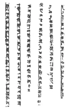 Written in clerical script, the Yinshu is 3,235 words long[11] and comprises some 113 bamboo slips,[4] some of which had already been damaged prior to their excavation. The text, presented as the "way of Ancestor Peng"[12] (彭祖之道也) discusses the causes of sickness and introduces gymnastic exercises and sexual practices that are named after either animals or the specific ailments that they are thought to target.[13] The exercises—which Livia Kohn likens to asanas in yoga[14]—and their benefits are summarised in twenty-four mnemonic statements.[15]