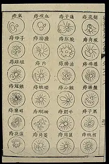 It also contains what is "probably the largest ensemble of illustrations in a single Chinese medical text", with some 484 such depictions of the human body, ranging from images of children's hands to a "one-page array of 24 anuses".[7] Depictions of smallpox—a disease that was especially deadly to the ruling Manchurians—are particularly prominent and detailed.[8]