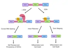 - ↑ Hickey, Christopher J.; Kim, Jung-Hyun; Ahn, Eun-Young Erin (2013-12-13). "New Discoveries of Old SON: A Link Between RNA Splicing and Cancer". Journal of Cellular Biochemistry. 115 (2): 224–231. doi:10.1002/jcb.24672. ISSN 0730-2312. PMID 24030980. S2CID 23130360.