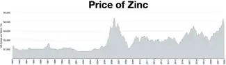 Identified world zinc resources total about 1.9–2.8 billion tonnes.[37][38] Large deposits are in Australia, Canada and the United States, with the largest reserves in Iran.[35][39][40] The most recent estimate of reserve base for zinc (meets specified minimum physical criteria related to current mining and production practices) was made in 2009 and calculated to be roughly 480 Mt.[41] Zinc reserves, on the other hand, are geologically identified ore bodies whose suitability for recovery is economically based (location, grade, quality, and quantity) at the time of determination. Since exploration and mine development is an ongoing process, the amount of zinc reserves is not a fixed number and sustainability of zinc ore supplies cannot be judged by simply extrapolating the combined mine life of today's zinc mines. This concept is well supported by data from the United States Geological Survey (USGS), which illustrates that although refined zinc production increased 80% between 1990 and 2010, the reserve lifetime for zinc has remained unchanged. About 346 million tonnes have been extracted throughout history to 2002, and scholars have estimated that about 109–305 million tonnes are in use.[42][43][44]