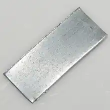 Zinc is a bluish-white, lustrous, diamagnetic metal,[25] though most common commercial grades of the metal have a dull finish.[26] It is somewhat less dense than iron and has a hexagonal crystal structure, with a distorted form of hexagonal close packing, in which each atom has six nearest neighbors (at 265.9 pm) in its own plane and six others at a greater distance of 290.6 pm.[27] The metal is hard and brittle at most temperatures but becomes malleable between 100 and 150 °C.[25][26] Above 210 °C, the metal becomes brittle again and can be pulverized by beating.[28] Zinc is a fair conductor of electricity.[25] For a metal, zinc has relatively low melting (419.5 °C) and boiling point (907 °C).[29] The melting point is the lowest of all the d-block metals aside from mercury and cadmium; for this reason among others, zinc, cadmium, and mercury are often not considered to be transition metals like the rest of the d-block metals.[29]