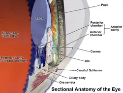 Anatomy of the anterior part of the human eye. "Suspensory ligaments" are labeled at left.