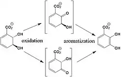 - 1 2 3 4 5 Sakaitani M, Rusnak F, Quinn NR, Tu C, Frigo TB, Berchtold GA, Walsh CT (July 1990). "Mechanistic studies on trans-2,3-dihydro-2,3-dihydroxybenzoate dehydrogenase (Ent A) in the biosynthesis of the iron chelator enterobactin". Biochemistry. 29 (29): 6789–98. doi:10.1021/bi00481a006. PMID 2144454.