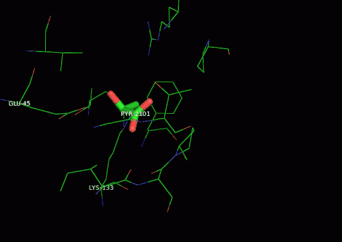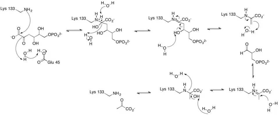 The active site contains the zwitterionic pair Glu-45/Lys-133.[9] The Lysine, which is involved in the formation of the Schiff base is coordinated by a phosphate ion and two solvent water molecules.[6][7] The first water molecule serves as a shuttle between the Glutamate and the substrate, staying bound to the enzyme throughout the catalytic cycle.[7] The second water molecule is a product of the dehydration of the carbinolamine that leads to the formation of the Schiff base.[7] It also functions as the nucleophile during hydrolysis of the enzyme-product Schiff base, leading to the release of pyruvate.[7]