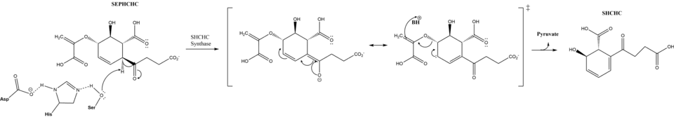The active site contains a catalytic triad of syrine, histine and arginine, which is conserved across all mutants and is proposed to initiate the reaction.[1] The triad residues are located at Ser86, Asp210, and His232.[5] This triad is proposed to catalyze a proton extraction which triggers a transfer of electrons leading to the elimination of pyruvate and formation of SHCHC.[6] Originally, it was proposed that the transition state was stabilized by a nontraditional oxyanion hole. Now a traditional oxyanion hole is favored, but not definitive.[5]