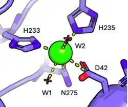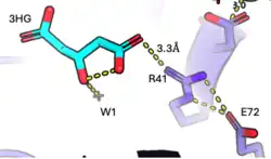 Electron density was observed indicating a bound metal ion, presumably Mg2+ due to its inclusion in the crystallization medium. The enzyme activity is dependent on the presence of the metal this was determined by mutating His233 to Ala233 and Asp42 to Asn42 and experiencing catalytic deficiency of 6.4E−3 kcat/kM and 1.3E−5 kcat/kM respectively. The substrate binding site includes arginine 41 making a salt bridge to the carboxylate of the hydroxyglutaric acid closest to metal ion. A mutation in Arg 41 results in a drastic decrease of catalytic activity. The extreme decrease in efficiency suggests the direct involvement in the chemistry of the catalytic reaction. This Arg41 also salt bridges to Glu72 to fold into the correct position and charge balance Arg41 to bind to the substrate.