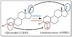 The chemical structure of 4-OHE1 is a hydroxylated and oxidized form of 17β-estradiol (17β-E2). Specifically the 4th position of the estrogen ring in 17β-E2 is hydroxylated and the 17th position of the . Structural comparisons between 4-OHE1 and 17β-E2 show a congruent steroid backbone, but the additional hydroxyl group in 4-OHE1 changes its biochemical properties. 4-OHE1 exhibits enhanced carcinogenic activities within the human body as compared to 17β-E2.[6][7][8]