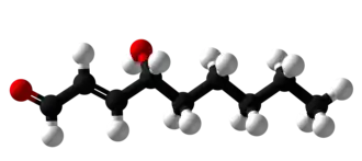 4-Hydroxynonenal, or 4-hydroxy-2E-nonenal or 4-hydroxy-2-nonenal or 4-HNE or HNE, (C9H16O2), is an α,β-unsaturated hydroxyalkenal that is produced by lipid peroxidation in cells. 4-HNE is the primary α,β-unsaturated hydroxyalkenal formed in this process. It is a colorless oil. It is found throughout animal tissues, and in higher quantities during oxidative stress due to the increase in the lipid peroxidation chain reaction, due to the increase in stress events. 4-HNE has been hypothesized to play a key role in cell signal transduction, in a variety of pathways from cell cycle events to cellular adhesion.[2]