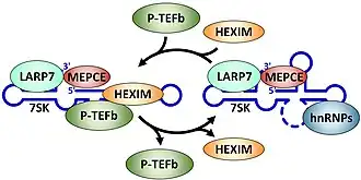 An early study indicated that 7SK in cells is associated with a number of proteins and probing of the secondary structure suggested a model for base pairing between different regions of the RNA.[3] A breakthrough in the function of the 7SK snRNP came with the finding that the positive transcription elongation factor P-TEFb was a component of the complex.[4][5] 7SK associates with and inhibits the cyclin dependent kinase activity of P-TEFb through the action of the RNA binding proteins HEXIM1[6][7] or HEXIM2.[8][9] The gamma phosphate at the 5' end of 7SK is methylated by the methylphosphate capping enzyme MEPCE which is a constitutive component of the 7SK snRNP.[10] A La related protein LARP7 is also found associated with 7SK, presumably in part through its interaction with the 3' end of the RNA.[11][12][13] Reduction of either MEPCE or LARP7 by siRNA mediated knockdown leads to destabilization of 7SK in vivo. A subset of 7SK snRNPs lack P-TEFb and HEXIM, but contains hnRNPs instead.[14]