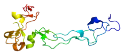 Although no crystallographic x-ray diffraction analyses have been published that depict the entire structure of ADAM10, one domain has been studied using this technique. The disintegrin and cysteine-rich domain (shown to the right) plays an essential role in regulation of protease activity in vivo. Recent experimental evidence suggests that this region, which is distinct from the active site, may be responsible for substrate specificity of the enzyme. It is proposed that this domain binds to particular regions of the enzyme's substrate, allowing peptide bond hydrolysis to occur in well defined locations on certain substrate proteins.[14]