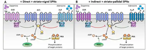 The mammalian adenylyl cyclase family comprises nine membrane adenylyl cyclases (mACs, AC1-9), and one soluble adenylyl cyclase (sAC, AC10). As an adenylyl cyclase, AC5 catalyses the production of the second messenger cAMP from ATP, under the regulation of G proteins.[10][11] The level of cellular cAMP controls the activity of protein kinase A (PKA), which phosphorylates target proteins. Upon phosphorylation, these effectors allow the cellular response to stimulation of G protein-coupled receptors (GPCR). However, AC5 differs from other mACs by its sequence and length, its expression pattern and its regulation. AC5 has been identified as the primary AC isoform expressed in MSNs.[12] The striatum controls movement via a subtle balance between the activity of two types of MSNs: the striato-nigral MSNs of the direct pathway that facilitate movement execution and the striato-pallidal MSNs of the indirect pathway that inhibit movement execution. The synthesis of cAMP by AC5 in MSNs is finely regulated by G protein-coupled receptors. AC5 is activated by the Gαolf protein (encoded by the GNAL gene) downstream of the D1 dopamine receptor (D1R) in the direct pathway and the adenosine A2A receptor (A2AR) in the indirect pathway, while it is inhibited by Gαi/o downstream of the D2 dopamine receptors (D2R) in the direct pathway and the adenosine A1 receptor (A1R) in the indirect pathway. cAMP levels in direct/indirect MSNs are critical for the activation of their target neurons, and thus facilitation or inhibition of movement.