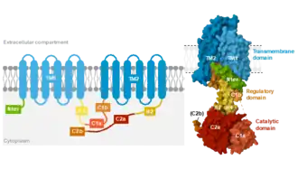 AC5 is encoded by the ADCY5 gene, located on the long arm of chromosome 3. The AC5 protein is composed of an intracytoplasmic N-terminal domain, a first membrane subdomain of 6 transmembrane segments, a first catalytic subdomain (C1a), a regulatory domain (C1b), a second membrane subdomain of 6 transmembrane segments, and a second catalytic subdomain (C2a). In contrast to other ACs, AC5 doesn't have a complete C-terminal regulatory domain (C2b). In the cytoplasm, the 2 catalytic subdomains associate to form the catalytic domain, binding ATP and converting it into cAMP. The 2 membrane subdomains are associated to form a single bundle in the plasmic membrane.[7] The transmembrane domain is prolonged by 2 cytoplasmic helices (H1 and H2) forming a coiled-coil domain which separates the core catalytic domain from the membrane. The conformation of the C1b regulatory and coiled-coil domains as well as their association with the various subunits of the G proteins change the dynamic conformation of the 2 catalytic subdomains and impact the catalytic activity of AC5. The N-terminal domain may participate in regulation by G proteins;[8][9] however, its structural organization is only partly solved.