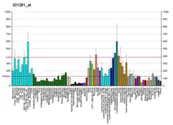 - ↑ Shimada S, Ogawa M, Takahashi M, Schlom J, Greiner JW (Jul 1994). "Molecular cloning and characterization of the complementary DNA of an M(r) 110,000 antigen expressed by human gastric carcinoma cells and upregulated by gamma-interferon". Cancer Research. 54 (14): 3831–6. PMID 8033103.