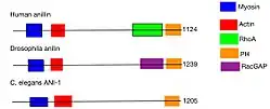 Anillin has a unique multi-domain structure. At the N-terminus, there is an actin- and myosin-binding domain. At the C-terminus, there is a PH domain. The PH domain is conserved and essential for anillin functionality.[8] The human anillin cDNA, located on Chr7, encodes a 1,125–amino acid protein with a predicted molecular mass of 124 kD and a pI of 8.1. The mouse anillin gene is located on Chromosome 9.[9]