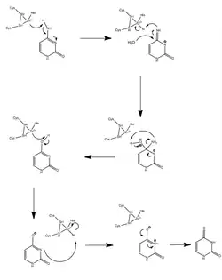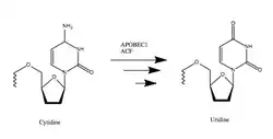 A1 modifies the cytosine base at position 6666 on the ApoB mRNA strand through a deamination.[9] An A1 dimer first binds to ACF, which forms the binding complex that is then able to eliminate the amine group from cytosine.