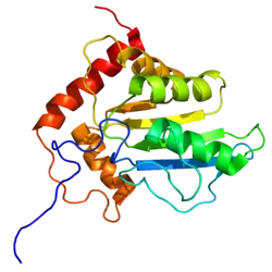 APOBEC3G (apolipoprotein B mRNA editing enzyme, catalytic subunit 3G) is a human enzyme encoded by the APOBEC3G gene that belongs to the APOBEC superfamily of proteins.[4] This family of proteins has been suggested to play an important role in innate anti-viral immunity.[5] APOBEC3G belongs to the family of cytidine deaminases that catalyze the deamination of cytidine to uridine in the single stranded DNA substrate.[4] The C-terminal domain of A3G renders catalytic activity, several NMR and crystal structures explain the substrate specificity and catalytic activity.[6][7][8][9][10][11][12][13]