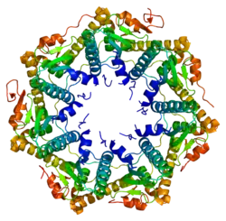 - ↑ Wang J, Hartling JA, Flanagan JM (November 1997). "The structure of ClpP at 2.3 A resolution suggests a model for ATP-dependent proteolysis". Cell. 91 (4): 447–456. doi:10.1016/s0092-8674(00)80431-6. PMID 9390554. S2CID 14136820.