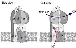 ![]() Simplified model of FOF1-ATPase alias ATP synthase of E. coli. Subunits of the enzyme are labeled accordingly. | |||||||||||