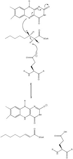 As the alpha carbon is being deprotonated, the pro-R hydrogen of the beta carbon leaves as a hydride to FAD in a concerted step. It adds to the Re face of FAD at the N-5 position, and the enzyme holds FAD in place through hydrogen bonding with the pyrimidine portion and hydrophobic interactions with the dimethylbenzene portion. The substrate has now been transformed into an α,β unsaturated thioester.[1]