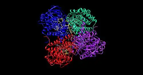 The medium chain acyl-CoA dehydrogenase (MCAD) is the best known structure of all ACADs, and is the most commonly deficient enzyme within the class that leads to metabolic disorders in animals.[1] This protein is a homotetramer with each subunit containing roughly 400 amino acids and one equivalent of FAD per monomer. The tetramer is classified as a "dimer of dimers" with an overall diameter of approximately 90 Å.[2]