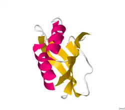Structures of this enzyme have been solved by both NMR and X-ray crystallography. See the links to PDB structures in the info boxes on the right for a current list of structures available in the PDB. The protein contains a beta sheet stacked on two alpha helices described by CATH as an Alpha-Beta Plait fold. The active site sits between sheet and helices and contains an arginine and an asparagine.[4] Most structures are monomeric [5]