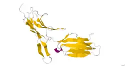 Mucosal vascular addressin cell adhesion molecule 1 (MAdCAM-1) is a protein that in humans is encoded by the MADCAM1 gene.[3][4][5] The protein encoded by this gene is an endothelial cell adhesion molecule that interacts preferentially with the leukocyte beta7 integrin LPAM-1 (alpha4 / beta7), L-selectin, and VLA-4 (alpha4 / beta1) on myeloid cells to direct leukocytes into mucosal and inflamed tissues. It is a member of the immunoglobulin superfamily and is similar to ICAM-1 and VCAM-1.[3]