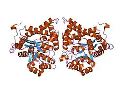 ADA exists in both small form (as a monomer) and large form (as a dimer-complex).[6] In the monomer form, the enzyme is a polypeptide chain,[7] folded into eight strands of parallel α/β barrels, which surround a central deep pocket that is the active site.[5] In addition to the eight central β-barrels and eight peripheral α-helices, ADA also contains five additional helices: residues 19-76 fold into three helices, located between β1 and α1 folds; and two antiparallel carboxy-terminal helices are located across the amino-terminal of the β-barrel.