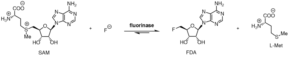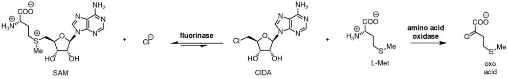 The halide preference, coupled to the position of the two reaction equilibria allows for a net transhalogenation reaction to be catalysed by the enzyme.[9] Incubation of 5'-chloro nucleosides with the enzyme, along with catalytic L-selenomethionine or L-methionine results in the production of 5-fluoro nucleosides. When [18F]fluoride is used, this transhalogenation reaction can be used for the synthesis of radiotracers for positron emission tomography.[10][11]