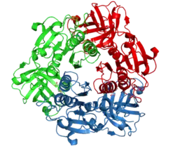 The names given to the enzyme come not from the structure, but from the function: 5-Fluoro-5-deoxyadenosine is the molecule synthesised. The structure is homologous to the duf-62 enzyme series. The enzyme is a dimer of trimers (2 molecules each with three subunits). The active sites are located between these subunits (subunit interfaces), each can bind to one SAM molecule at a time.[12]
