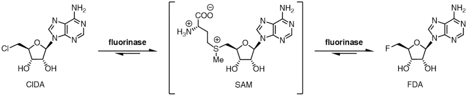 The fluorinase shows a degree of substrate tolerance for halide ion, and can also use chloride ion in place of fluoride ion. While the equilibrium for reaction between SAM and fluoride ion lies towards products FDA and L-methionine, the equilibrium position is reversed in the case for chloride ion. Incubation of SAM and chloride ion with the fluorinase does not result in generation of 5'-chloro-5'-deoxyadenosine (ClDA), unless an additional enzyme, an L-amino acid oxidase, is added. The amino acid oxidase removes the L-methionine from the reaction, converting it to the corresponding oxo-acid.