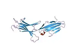 In molecular biology, the adhesin molecule (immunoglobulin-like) is a protein domain. This domain is found in mucosal vascular addressin cell adhesion molecule 1 proteins (MAdCAM-1). These are cell adhesion molecules expressed on the endothelium in mucosa that guide the specific homing of lymphocytes into mucosal tissues. MAdCAM-1 belongs to a subclass of the immunoglobulin superfamily (IgSF), the members of which are ligands for integrins.[1] The crystal structure of this domain has been reported; it adopts an immunoglobulin-like beta-sandwich structure, with seven strands arranged in two beta-sheets in a Greek-key topology.[1][2]