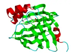 aP2 (adipocyte Protein 2)[5] is a carrier protein for fatty acids that is primarily expressed in adipocytes and macrophages. aP2 is also called fatty acid binding protein 4 (FABP4). Blocking this protein either through genetic engineering or drugs[6] has the possibility of treating heart disease and the metabolic syndrome.[7]