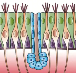 Basal cells are the stem cells or progenitors of the airway epithelium and can differentiate to replenish all of the epithelial cells including the ciliated cells, and secretory goblet cells.[2][3] This repairs the protective functions of the epithelial barrier.[3]
