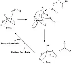 In the catalytic cycle, W(VI) (tungsten "six") converts to W(IV) concomitant with oxidation of the aldehyde to a carboxylic acid (equivalently, a carboxylate).[3] A W(V) intermediate can be detected by EPR spectroscopy.[3][8]