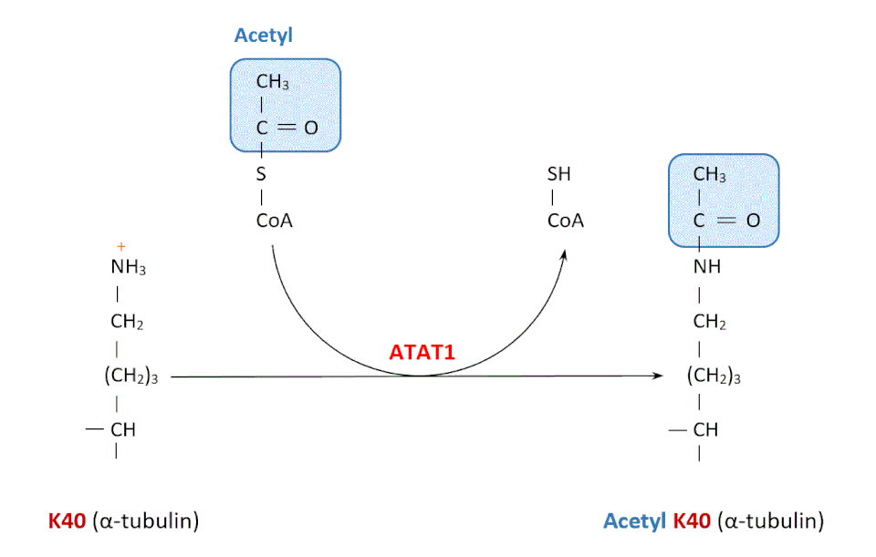 ATAT1 specifically acetylates ‘Lys-40’ in alpha tubulin on the lumenal side of microtubules. This is the only known posttranslational modification in the microtubule lumen, but it is still unknown how does the enzyme access the lumen.[8]