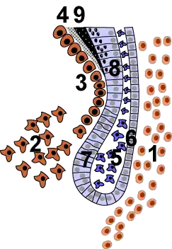 ![]() The cervical loop area: (1) dental follicle cells, (2) dental mesenchyme, (3) odontoblasts, (4) dentin, (5) stellate reticulum, (6) outer enamel epithelium, (7) inner enamel epithelium, (8) ameloblasts, (9) enamel. | |
