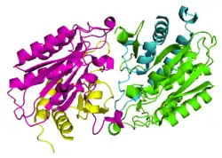 - 1 2 3 4 5 Lindner HA, Lunin VV, Alary A, Hecker R, Cygler M, Ménard R (November 2003). "Essential roles of zinc ligation and enzyme dimerization for catalysis in the aminoacylase-1/M20 family". The Journal of Biological Chemistry. 278 (45): 44496–504. doi:10.1074/jbc.M304233200. PMID 12933810.