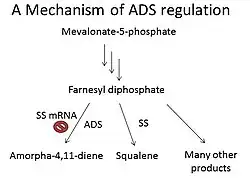 Regulatory switches help control levels of ADS. Since enzyme substrate Farnesyl diphosphate has many uses in addition to forming amorpha-4,11-diene, these other pathways regulate ADS. One such pathway is sterol biosynthesis, and in fact, the enzyme squalene synthase (SS) is considered a regulatory switch for ADS. When SS cDNA, which reduces SS mRNA concentration and therefore reduces expression of SS, is introduced into the plant cells, mRNA levels of ADS dramatically increased [7](Figure 1).